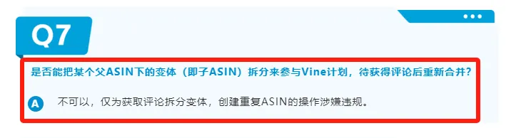 1、“仅为获取评论拆分变体,创建重复ASIN的操作涉嫌违规”,明确规定不允许将某个父 ASIN 下的变体拆分来参与 Vine 计划